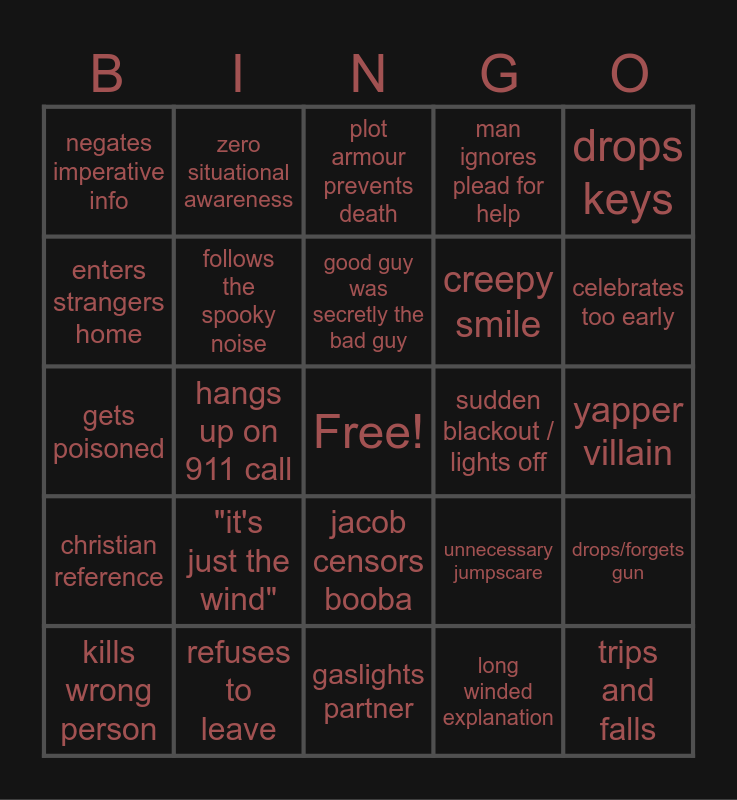 This bingo card has a free space and 50 words: white people racism, trips and falls, phone doesn't work, gaslights partner, "it's just the wind", doesn't double tap, zero situational awareness, lets stranger inside, enters strangers home, near miss cop, follows the spooky noise, man ignores plead for help, drops/forgets gun, unnecessary jumpscare, creepy kid, stupid kid, good guy was secretly the bad guy, sudden blackout / lights off, bad/creepy guy was actually the good guy, drops keys, hangs up on 911 call, long winded explanation, negates imperative info, creepy smile, jacob forgets to censor booba, does their own research, celebrates too early, minority dies first, plot armour prevents death, jacob censors booba, jacob malds and sides with villain, MC trusts stranger, MC stares into the void, denial because of pride, refuses to leave, everything tied up in house, innocent bystander / good samaritan killed, characters leaves and says they'll be right back, character fumbles stealth, yapper villain, villain disappears and then reappears, "it's a cult", excessive alcohol / drugs, extremely killable character, kills wrong person, gets poisoned, man speaks for women, MC has no family / dead family, christian reference and cheating.