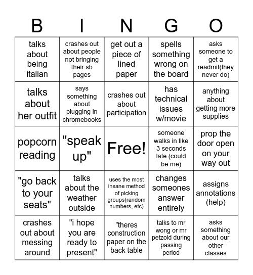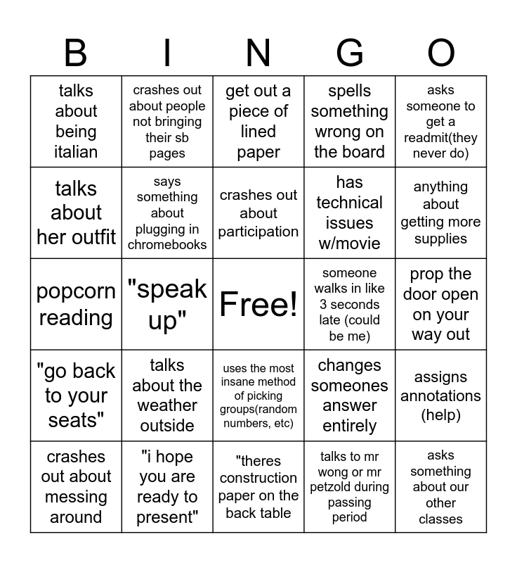 This bingo card has a free space and 24 words: talks about the weather outside, "i hope you are ready to present", crashes out about participation, crashes out about messing around, asks someone to get a readmit(they never do), talks about being italian, talks about her outfit, crashes out about people not bringing their sb pages, someone walks in like 3 seconds late (could be me), uses the most insane method of picking groups(random numbers, etc), has technical issues w/movie, popcorn reading, changes someones answer entirely, assigns annotations (help), says something about plugging in chromebooks, talks to mr wong or mr petzold during passing period, prop the door open on your way out, get out a piece of lined paper, anything about getting more supplies, "speak up", asks something about our other classes, "go back to your seats", spells something wrong on the board and "theres construction paper on the back table.