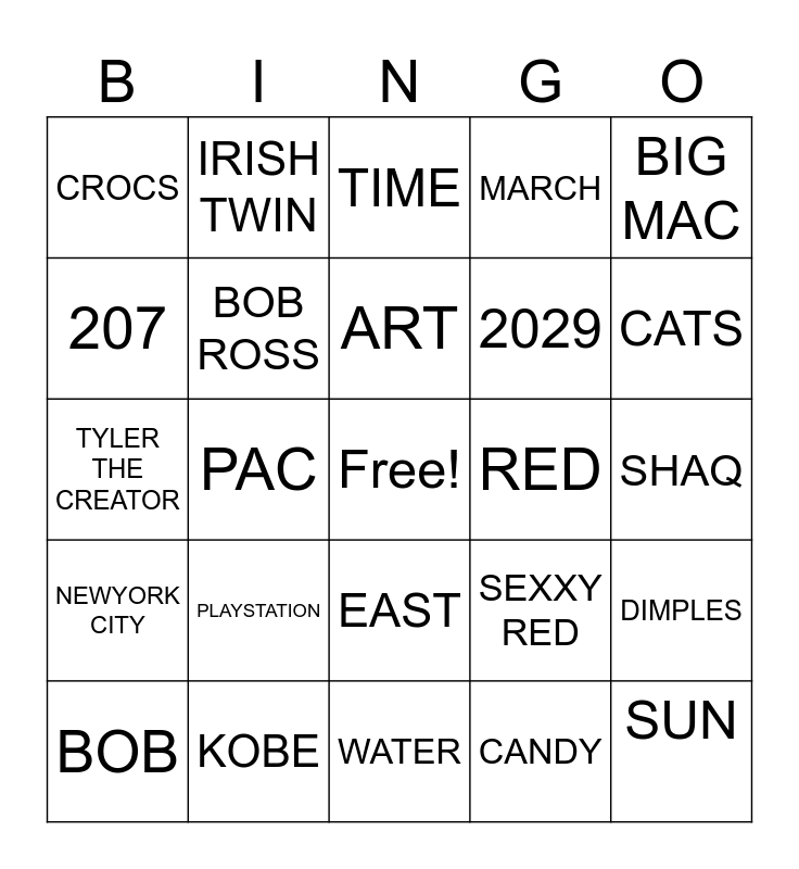 This bingo card has a free space and 29 words: BOB, BASKETBALL, PAC, 19, CROCS, TIME, BOB ROSS, PLAYSTATION, RED, KOBE, SHAQ, SUN, WATER, CANDY, CATS, ICE CREAM, EAST, NEWYORK CITY, BIG MAC, TYLER THE CREATOR, SEXXY RED, MOON, 2029, 207, MARCH, IRISH TWIN, DIMPLES, ART and SYRACUSE.