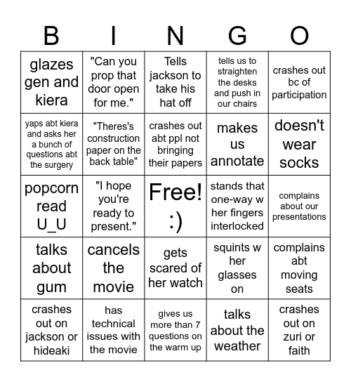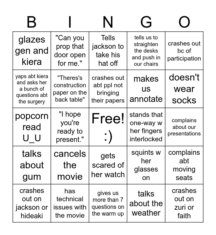 This bingo card has a free space and 24 words: cancels the movie, has technical issues with the movie, crashes out abt ppl not bringing their papers, crashes out on jackson or hideaki, crashes out bc of participation, glazes gen and kiera, yaps abt kiera and asks her a bunch of questions abt the surgery, "Can you prop that door open for me.", stands that one-way w her fingers interlocked, gets scared of her watch, makes us annotate, popcorn read U_U, squints w her glasses on, complains abt moving seats, "Theres's construction paper on the back table", talks about the weather, complains about our presentations, Tells jackson to take his hat off, doesn't wear socks, "I hope you're ready to present.", crashes out on zuri or faith, talks about gum, tells us to straighten the desks and push in our chairs and gives us more than 7 questions on the warm up.