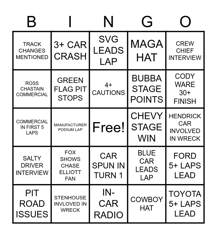 This bingo card has a free space and 24 words: FOX SHOWS CHASE ELLIOTT FAN, STENHOUSE INVLOVED IN WRECK, 4+ CAUTIONS, PIT ROAD ISSUES, CREW CHIEF INTERVIEW, TRACK CHANGES MENTIONED, ROSS CHASTAIN COMMERCIAL, 3+ CAR CRASH, CHEVY STAGE WIN, CAR SPUN IN TURN 1, BUBBA STAGE POINTS, COMMERCIAL IN FIRST 5 LAPS, BLUE CAR LEADS LAP, FORD 5+ LAPS LEAD, GREEN FLAG PIT STOPS, COWBOY HAT, HENDRICK CAR INVOLVED IN WRECK, SVG LEADS LAP, CODY WARE 30+ FINISH, MANUFACTURER PODIUM LAP, TOYOTA 5+ LAPS LEAD, SALTY DRIVER INTERVIEW, MAGA HAT and IN-CAR RADIO.