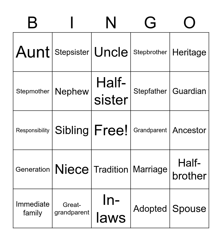 This bingo card has a free space and 29 words: Immediate family, Extended family, Sibling, Cousin, Aunt, Uncle, Nephew, Niece, Grandparent, Great-grandparent, Ancestor, Spouse, In-laws, Adopted, Guardian, Household, Tradition, Generation, Heritage, Responsibility, Marriage, Relationship, Stepfather, Stepmother, Stepbrother, Stepsister, Half-brother, Half-sister and Divorce.