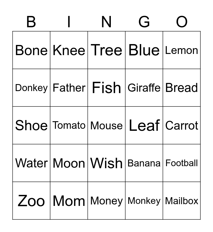 This bingo card has 28 words: Football, Elephant, Giraffe, Monkey, Donkey, Tree, Knee, Water, Leaf, Zoo, Shoe, Blue, Mom, Money, Bread, Mitten, Moon, Father, Fish, Wish, Bone, Mailbox, Mouse, Tomato, Carrot, Banana, Lemon and Cucumber.