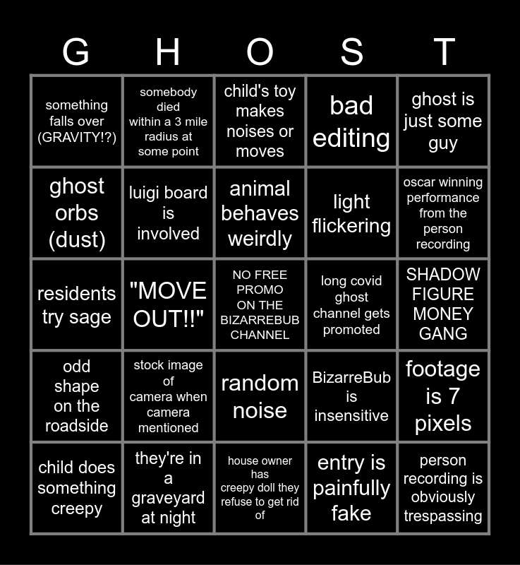 This bingo card has 25 words: stock image of camera when camera mentioned, house owner has creepy doll they refuse to get rid of, animal behaves weirdly, child does something creepy, ghost is just some guy, something falls over (GRAVITY!?), ghost orbs (dust), somebody died within a 3 mile radius at some point, long covid ghost channel gets promoted, random noise, light flickering, residents try sage, BizarreBub is insensitive, footage is 7 pixels, luigi board is involved, person recording is obviously trespassing, SHADOW FIGURE MONEY GANG, child's toy makes noises or moves, oscar winning performance from the person recording, "MOVE OUT!!", NO FREE PROMO ON THE BIZARREBUB CHANNEL, they're in a graveyard at night, odd shape on the roadside, bad editing and entry is painfully fake.