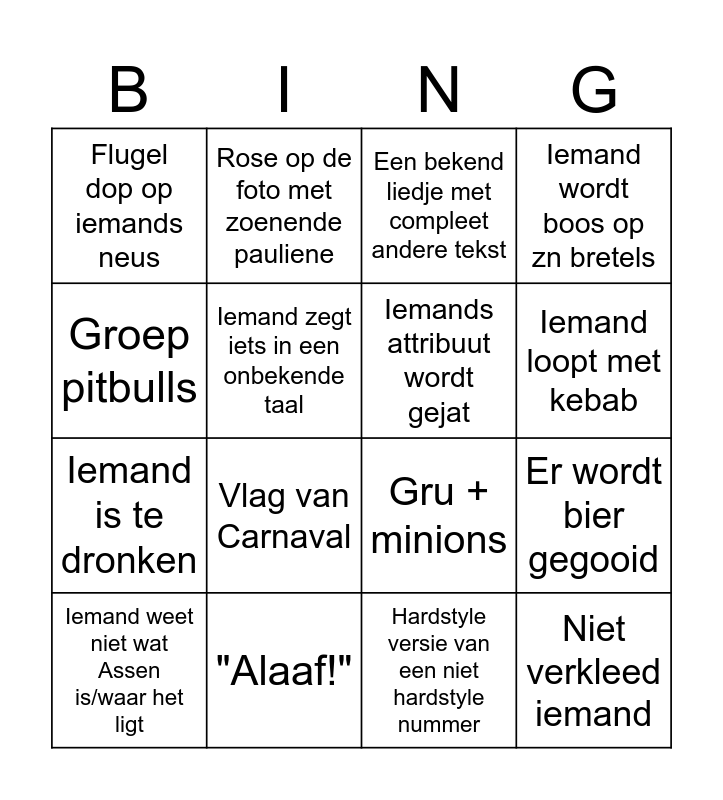 This bingo card has 16 words: "Alaaf!", Er wordt bier gegooid, Een bekend liedje met compleet andere tekst, Flugel dop op iemands neus, Iemand is te dronken, Rose op de foto met zoenende pauliene, Gru + minions, Hardstyle versie van een niet hardstyle nummer, Groep pitbulls, Iemand zegt iets in een onbekende taal, Iemand weet niet wat Assen is/waar het ligt, Iemand wordt boos op zn bretels, Vlag van Carnaval, Iemand loopt met kebab, Iemands attribuut wordt gejat and Niet verkleed iemand.