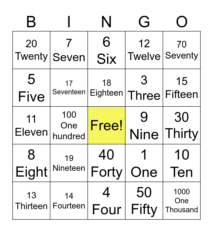 This bingo card has a free space and 27 words: 1 One, 2 Two, 3 Three, 4 Four, 5 Five, 6 Six, 7 Seven, 8 Eight, 9 Nine, 10 Ten, 11 Eleven, 12 Twelve, 13 Thirteen, 14 Fourteen, 15 Fifteen, 16 Sixteen, 17 Seventeen, 18 Eighteen, 19 Nineteen, 20 Twenty, 30 Thirty, 50 Fifty, 100 One hundred, 1000 One Thousand, 40 Forty, 70 Seventy and 80 Eighty.