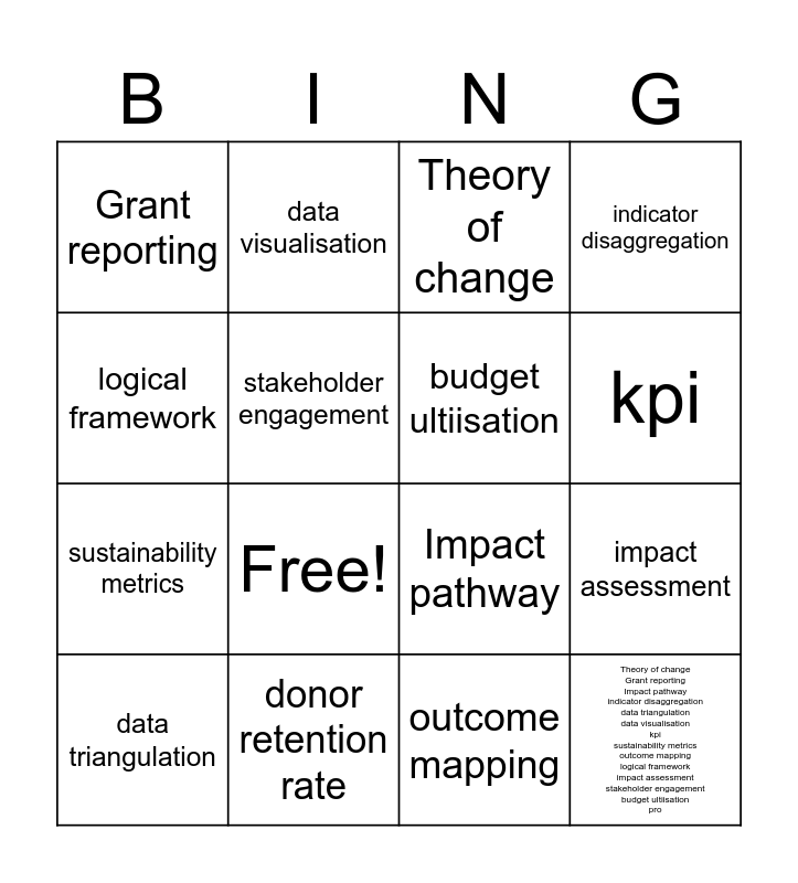 This bingo card has 18 words: Free!, Theory of change Grant reporting Impact pathway indicator disaggregation data triangulation data visualisation kpi sustainability metrics outcome mapping logical framework impact assessment stakeholder engagement budget ultiisation pro, Theory of change, Grant reporting, Impact pathway, indicator disaggregation, data triangulation, data visualisation, kpi, sustainability metrics, outcome mapping, logical framework, impact assessment, stakeholder engagement, budget ultiisation, program outcomes, donor retention rate and cost benefit analysis.