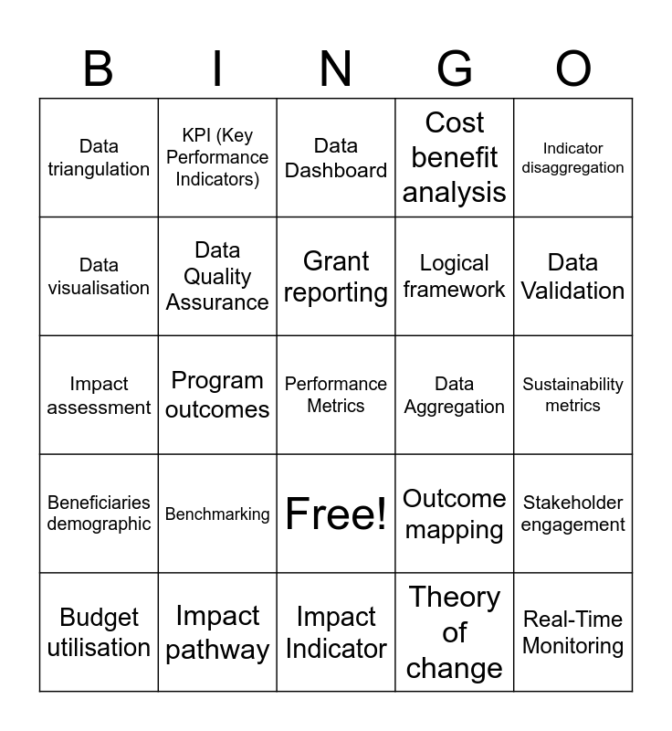 This bingo card has 26 words: Free!, Theory of change, Grant reporting, Impact pathway, Indicator disaggregation, Data triangulation, Data visualisation, KPI (Key Performance Indicators), Sustainability metrics, Outcome mapping, Logical framework, Impact assessment, Stakeholder engagement, Budget utilisation, Program outcomes, Donor retention rate, Cost benefit analysis, Beneficiaries demographic, Data Dashboard, Performance Metrics, Data Validation, Impact Indicator, Data Aggregation, Benchmarking, Data Quality Assurance and Real-Time Monitoring.