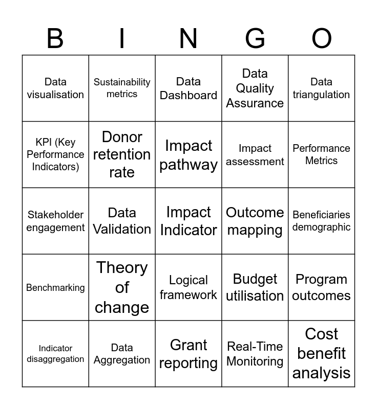 This bingo card has 25 words: Theory of change, Grant reporting, Impact pathway, Indicator disaggregation, Data triangulation, Data visualisation, KPI (Key Performance Indicators), Sustainability metrics, Outcome mapping, Logical framework, Impact assessment, Stakeholder engagement, Budget utilisation, Program outcomes, Donor retention rate, Cost benefit analysis, Beneficiaries demographic, Data Dashboard, Performance Metrics, Data Validation, Impact Indicator, Data Aggregation, Benchmarking, Data Quality Assurance and Real-Time Monitoring.