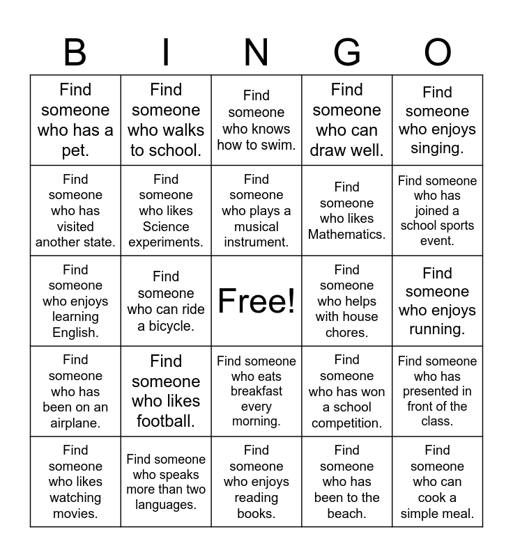 This bingo card has a free space and 25 words: Find someone who likes football., Find someone who enjoys reading books., Find someone who plays a musical instrument., Find someone who likes watching movies., Find someone who enjoys singing., Find someone who has a pet., Find someone who has visited another state., Find someone who walks to school., Find someone who helps with house chores., Find someone who eats breakfast every morning., Find someone who likes Mathematics., Find someone who enjoys learning English., Find someone who has won a school competition., Find someone who has presented in front of the class., Find someone who likes Science experiments., Find someone who plays badminton., Find someone who enjoys running., Find someone who knows how to swim., Find someone who has joined a school sports event., Find someone who can ride a bicycle., Find someone who can cook a simple meal., Find someone who speaks more than two languages., Find someone who has been on an airplane., Find someone who can draw well. and Find someone who has been to the beach..