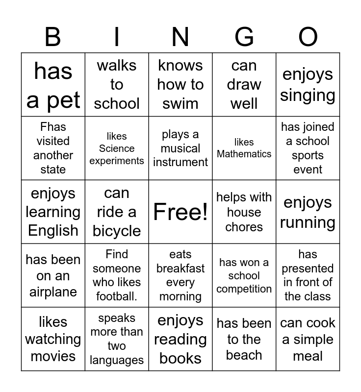 This bingo card has a free space and 25 words: Find someone who likes football., enjoys reading books, plays a musical instrument, likes watching movies, enjoys singing, has a pet, Fhas visited another state, walks to school, helps with house chores, eats breakfast every morning, likes Mathematics, enjoys learning English, has won a school competition, has presented in front of the class, likes Science experiments, plays badminton, enjoys running, knows how to swim, has joined a school sports event, can ride a bicycle, can cook a simple meal, speaks more than two languages, has been on an airplane, can draw well and has been to the beach.