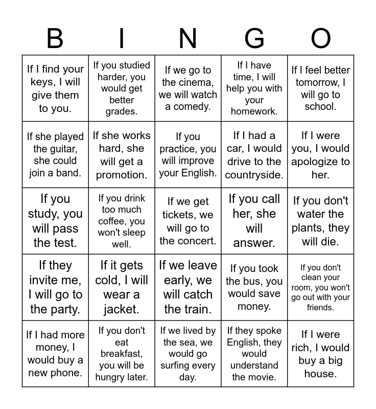 This bingo card has 41 words: Free!, If you study, you will pass the test., If it rains, we will stay home., If she works hard, she will get a promotion., If you don't eat breakfast, you will be hungry later., If we leave early, we will catch the train., If you practice, you will improve your English., If the sun shines, we will go to the beach., If I feel better tomorrow, I will go to school., If they invite me, I will go to the party., If you drink too much coffee, you won't sleep well., If I have time, I will help you with your homework., If we get tickets, we will go to the concert., If you don't water the plants, they will die., If you call her, she will answer., If it gets cold, I will wear a jacket., If you don't wear sunscreen, you will get sunburned., If I find your keys, I will give them to you., If the store is open, I will buy some groceries., If we go to the cinema, we will watch a comedy., If you don't clean your room, you won't go out with your friends., If I were rich, I would buy a big house., If we lived by the sea, we would go surfing every day., If I had a car, I would drive to the countryside., If she knew how to cook, she would make dinner tonight., If he practiced more, he would be the best player on the team., If they spoke English, they would understand the movie., If I won the lottery, I would travel the world., If I were you, I would apologize to her., If he had more time, he would read more books., If we had a garden, we would grow our own vegetables., If you studied harder, you would get better grades., If I had more money, I would buy a new phone., If we lived in Spain, we would eat tapas every day., If you took the bus, you would save money., If she played the guitar, she could join a band., If I were taller, I would play basketball., If they had a dog, they would walk it every day., If it snowed here, we could build a snowman., If I had more time, I would take up a new hobby. and If we had tickets, we would go to the football match..