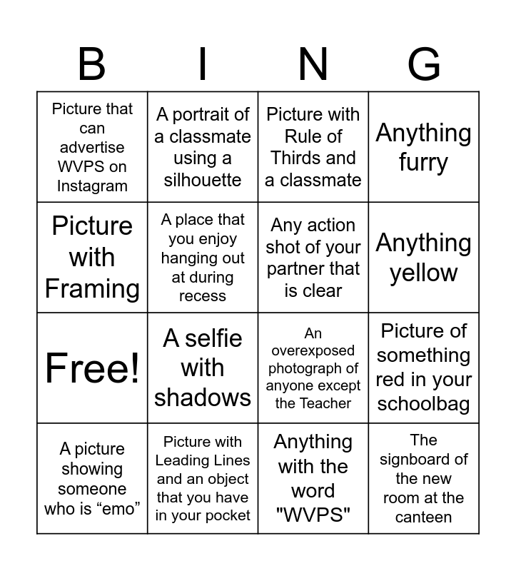 This bingo card has 20 words: Picture of something red in your schoolbag, Picture with Minimalism and a person, Picture with Rule of Thirds and a classmate, A selfie that tells me more about things you like, A picture showing someone who is “emo”, Picture with Framing, Picture with Leading Lines and an object that you have in your pocket, Picture that can advertise WVPS on Instagram, Free!, A portrait of a classmate using a silhouette, A selfie with shadows, An overexposed photograph of anyone except the Teacher, A place that you enjoy hanging out at during recess, The signboard of the new room at the canteen, Any action shot of your partner that is clear, Something blue that you really like, Anything yellow, Anything furry, Anything with the word "WVPS" and Someone you enjoy hanging out with.