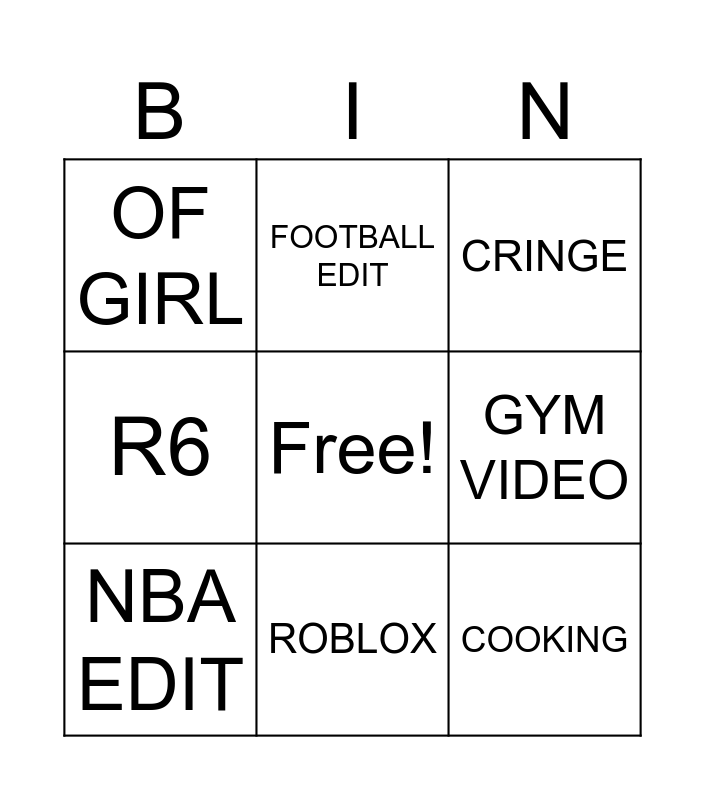 This bingo card has a free space and 8 words: GYM VIDEO, CRINGE, FOOTBALL EDIT, NBA EDIT, OF GIRL, COOKING, R6 and ROBLOX.