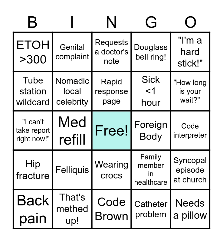 This bingo card has a free space and 24 words: Felliquis, That's methed up!, Rapid response page, Back pain, "I'm a hard stick!", ETOH >300, Tube station wildcard, Genital complaint, Foreign Body, Wearing crocs, Sick <1 hour, "I can't take report right now!", Family member in healthcare, Syncopal episode at church, Nomadic local celebrity, Catheter problem, Code interpreter, Requests a doctor's note, "How long is your wait?", Med refill, Needs a pillow, Hip fracture, Douglass bell ring! and Code Brown.