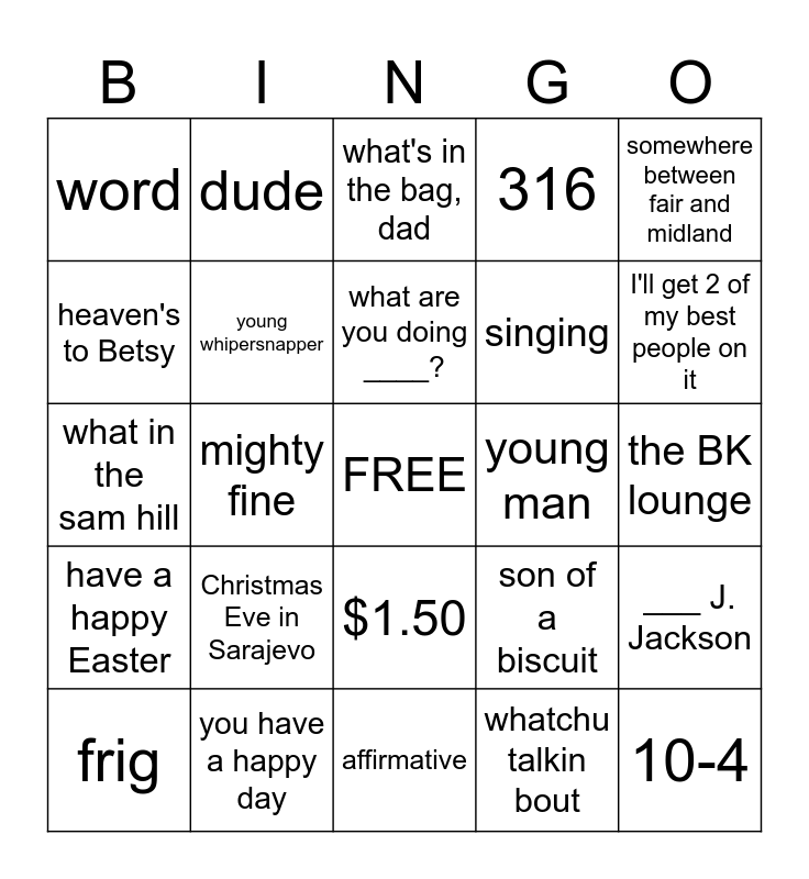 This bingo card has a free space and 24 words: Christmas Eve in Sarajevo, you have a happy day, what are you doing ____?, frig, somewhere between fair and midland, word, heaven's to Betsy, dude, young man, $1.50, singing, what in the sam hill, son of a biscuit, ___ J. Jackson, young whipersnapper, whatchu talkin bout, the BK lounge, what's in the bag, dad, I'll get 2 of my best people on it, mighty fine, 10-4, have a happy Easter, 316 and affirmative.