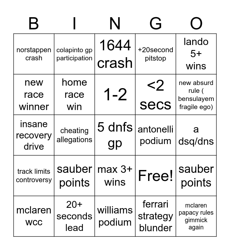 This bingo card has 25 words: sauber points, williams podium, 1-2, mclaren wcc, lando 5+ wins, norstappen crash, new race winner, colapinto gp participation, antonelli podium, max 3+ wins, <2 secs, insane recovery drive, Free!, sauber points, home race win, mclaren papacy rules gimmick again, a dsq/dns, 1644 crash, new absurd rule ( bensulayem fragile ego), cheating allegations, 5 dnfs gp, 20+ seconds lead, track limits controversy, +20second pitstop and ferrari strategy blunder.