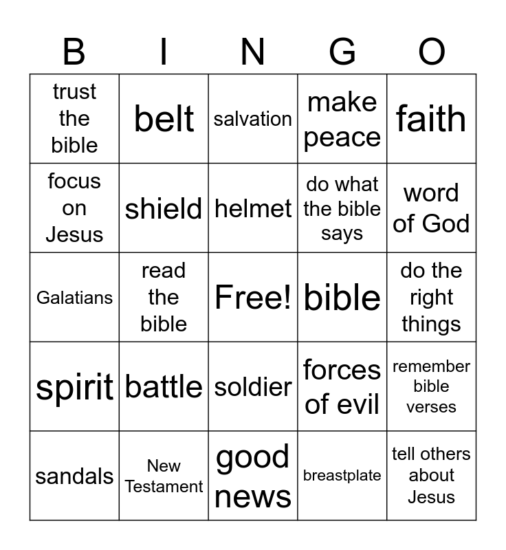 This bingo card has a free space and 34 words: armor of God, breastplate, righteousness, sword, spirit, shield, faith, sandals, belt, truth, helmet, salvation, peace, Gospel, bible, word of God, New Testament, Galatians, battle, forces of evil, soldier, tell the truth, trust the bible, do the right things, good news, tell others about Jesus, make peace, believe, do what the bible says, focus on Jesus, ask Jesus into our hearts, read the bible, remember bible verses and Sunday School.