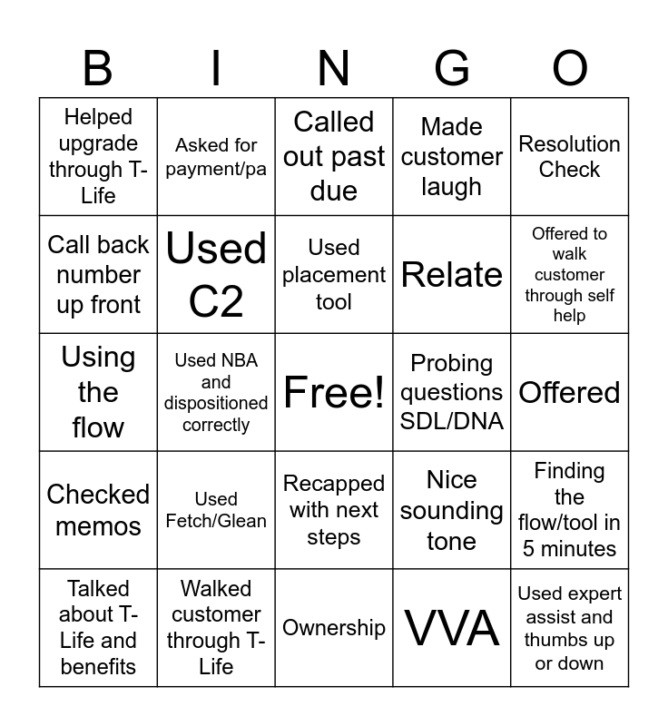 This bingo card has a free space and 27 words: Nice sounding tone, Acknowledge customer effort for calling in, Relate, Ownership, Call back number up front, Called out past due, Asked for payment/pa, Checked memos, Probing questions SDL/DNA, Finding the flow/tool in 5 minutes, Using the flow, Made customer laugh, Talked about T-Life and benefits, Walked customer through T-Life, Offered to walk customer through self help, Sent self help, Used C2, Used placement tool, Used Fetch/Glean, Helped upgrade through T-Life, Offered, VVA, Used NBA and dispositioned correctly, Used expert assist and thumbs up or down, Recapped with next steps, Resolution Check and No call back statement.