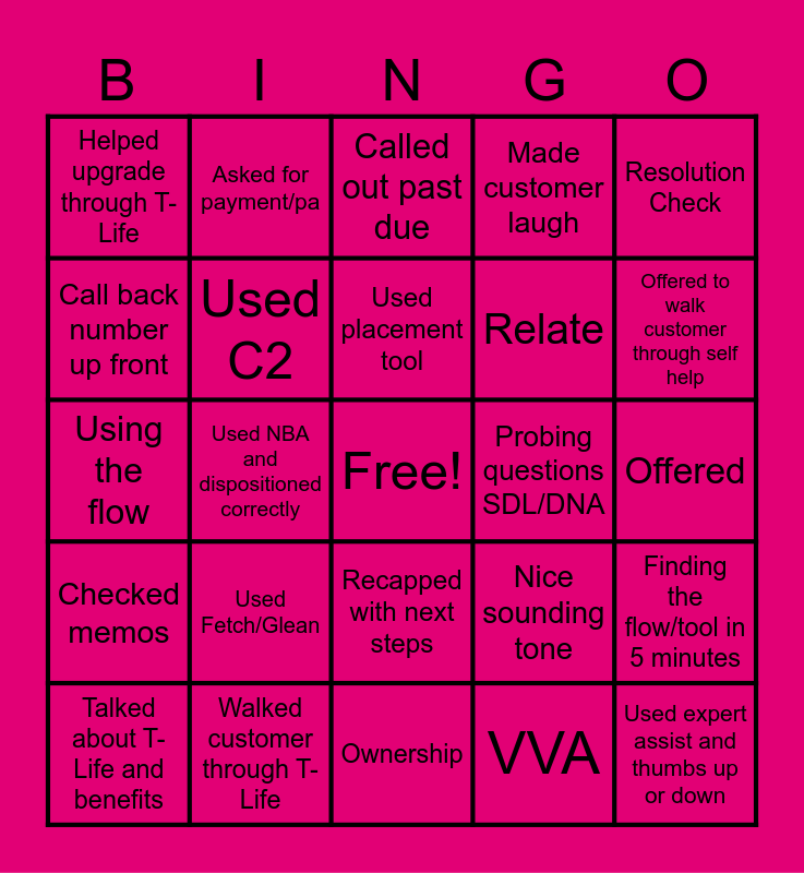 This bingo card has a free space and 27 words: Nice sounding tone, Acknowledge customer effort for calling in, Relate, Ownership, Call back number up front, Called out past due, Asked for payment/pa, Checked memos, Probing questions SDL/DNA, Finding the flow/tool in 5 minutes, Using the flow, Made customer laugh, Talked about T-Life and benefits, Walked customer through T-Life, Offered to walk customer through self help, Sent self help, Used C2, Used placement tool, Used Fetch/Glean, Helped upgrade through T-Life, Offered, VVA, Used NBA and dispositioned correctly, Used expert assist and thumbs up or down, Recapped with next steps, Resolution Check and No call back statement.