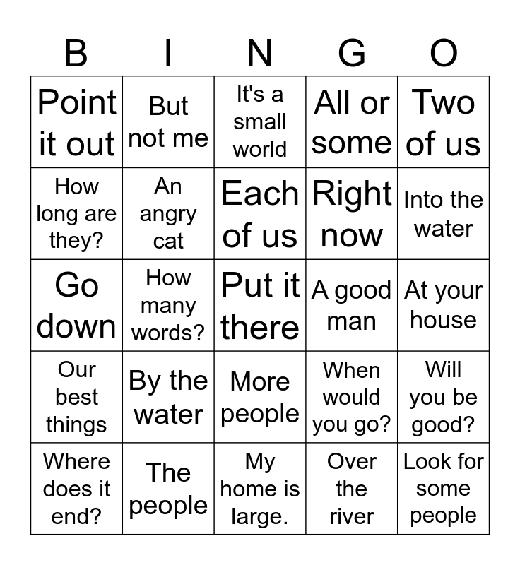 This bingo card has 30 words: The people, Did you see it?, How many words?, One more time, Point it out, It's a small world, An angry cat, More people, A good man, My home is large., At your house, Put it there, Over the river, Look for some people, Into the water, A long time, When would you go?, Our best things, By the water, Two of us, Go down, The first word, But not me, Right now, How long are they?, All or some, Will you be good?, Where does it end?, Each of us and From my room.