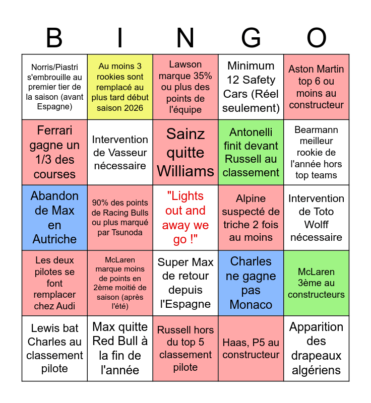 This bingo card has a free space and 24 words: McLaren marque moins de points en 2ème moitié de saison (après l'été), Max quitte Red Bull à la fin de l'année, Sainz quitte Williams, Lewis bat Charles au classement pilote, Aston Martin top 6 ou moins au constructeur, Norris/Piastri s'embrouille au premier tier de la saison (avant Espagne), Ferrari gagne un 1/3 des courses, Au moins 3 rookies sont remplacé au plus tard début saison 2026, Alpine suspecté de triche 2 fois au moins, Super Max de retour depuis l'Espagne, Antonelli finit devant Russell au classement, Abandon de Max en Autriche, Charles ne gagne pas Monaco, McLaren 3ème au constructeurs, Intervention de Vasseur nécessaire, Haas, P5 au constructeur, Intervention de Toto Wolff nécessaire, Lawson marque 35% ou plus des points de l'équipe, Bearmann meilleur rookie de l'année hors top teams, 90% des points de Racing Bulls ou plus marqué par Tsunoda, Apparition des drapeaux algériens, Les deux pilotes se font remplacer chez Audi, Minimum 12 Safety Cars (Réel seulement) and Russell hors du top 5 classement pilote.