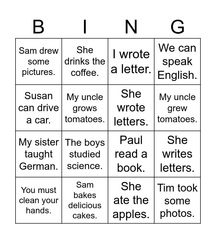 This bingo card has 17 words: She ate the apples., You must clean your hands., I wrote a letter., Sam drew some pictures., The boys studied science., We can speak English., She writes letters., She wrote letters., My uncle grew tomatoes., My uncle grows tomatoes., Sam bakes delicious cakes., Paul read a book., Susan can drive a car., She drinks the coffee., My sister taught German., Paul won the competition. and Tim took some photos..