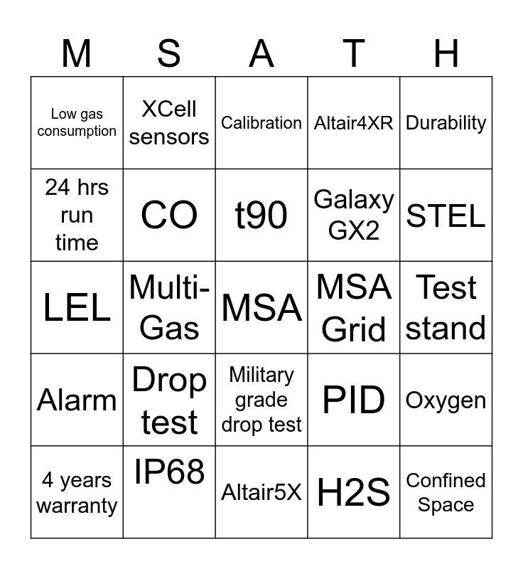 This bingo card has a free space and 24 words: Drop test, IP68, t90, 4 years warranty, Durability, Low gas consumption, 24 hrs run time, XCell sensors, MSA Grid, Military grade drop test, Galaxy GX2, LEL, PID, Oxygen, CO, H2S, Test stand, Calibration, STEL, Multi-Gas, Confined Space, Alarm, Altair4XR and Altair5X.