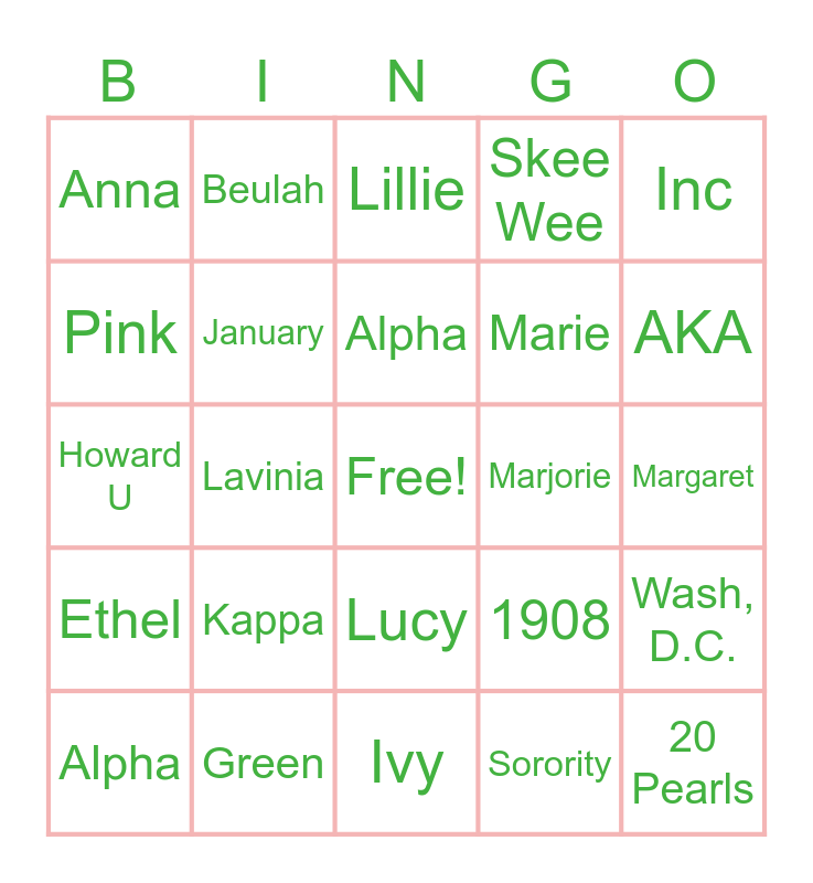 This bingo card has a free space and 24 words: Alpha, Kappa, Alpha, Sorority, Inc, Anna, Beulah, Lillie, Marjorie, Margaret, Howard U, January, 1908, Wash, D.C., Pink, Green, Ivy, Skee Wee, AKA, Ethel, Lavinia, Lucy, Marie and 20 Pearls.