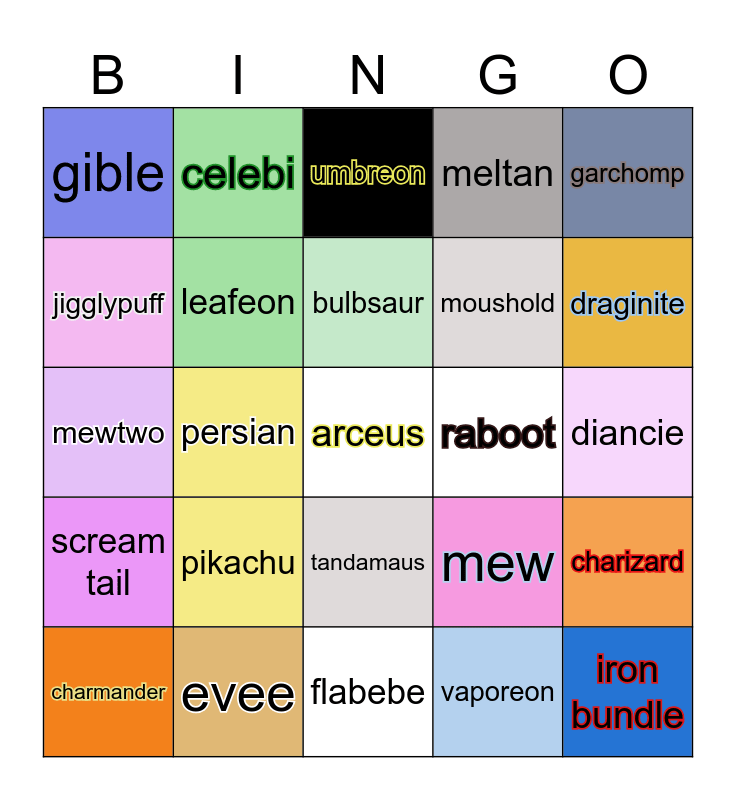 This bingo card has a free space and 24 words: pikachu, evee, bulbsaur, charmander, garchomp, gible, jigglypuff, celebi, raboot, tandamaus, moushold, mewtwo, mew, charizard, leafeon, vaporeon, diancie, umbreon, draginite, persian, iron bundle, scream tail, meltan and flabebe.