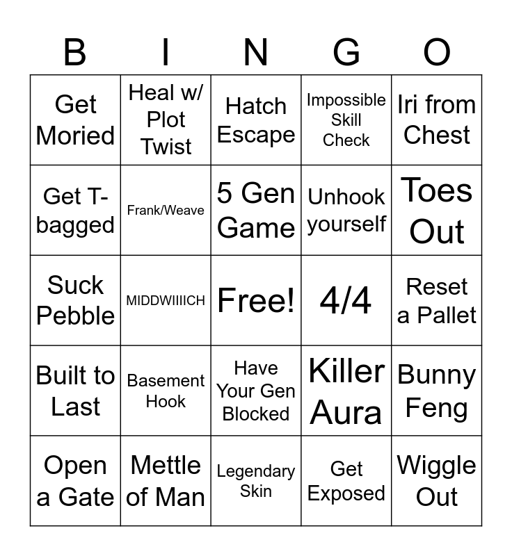 This bingo card has a free space and 82 words: Get Slugged, Pallet Stun, Hatch Escape, Blastmine, Bs Hatchet, Tombstone Myers, TTV, Boon/Hex Name, Cleanse Hex, Hit Through Pallet, Bot, Sole Survivor, Frank/Weave, 4/4, Everyone Escapes, Get Moried, Open a Gate, Get T-bagged, Friendly Killer, Sandbagged, Self Care, Unhook yourself, Wiggle Out, Iri from Chest, MIDDWIIIICH, Sent to Crows, Killer+Map, Lag Out, Teammate blows you, Scoops, Basement Hook, Invocation, Suck Pebble, Hit DS, Skull Merch, Legendary Skin, P100, Adept, Toes Out, Bleed Out, Escape w/ no mither, Impossible Skill Check, Get Tunneled, 3-Genned, Flashlight Save, Heal w/ Plot Twist, Facial, 5 Gen Game, Shoulder a Burden, Escape a Chase In a Locker, Unbreakable, Reset a Pallet, Mettle of Man, Dramaturgy Expose, Play a song, Light a Boon, Chem Trap, Suck Dead Hard, Sabo a Hook, Killer Aura, Max Autodidact, Inner Strength, Built to Last, Exult, Broken Heal, BP Frenzy, Trickster, Bamboozle, Start w/ Effect, Get Jump-scared, Xeno, Chuckle Charles, Have Your Gen Blocked, Get Exposed, First Chase, Deep Wound, Locker Grab, Locker Juke, Leon, Goofy Ace, Bunny Feng and Nic Cage.