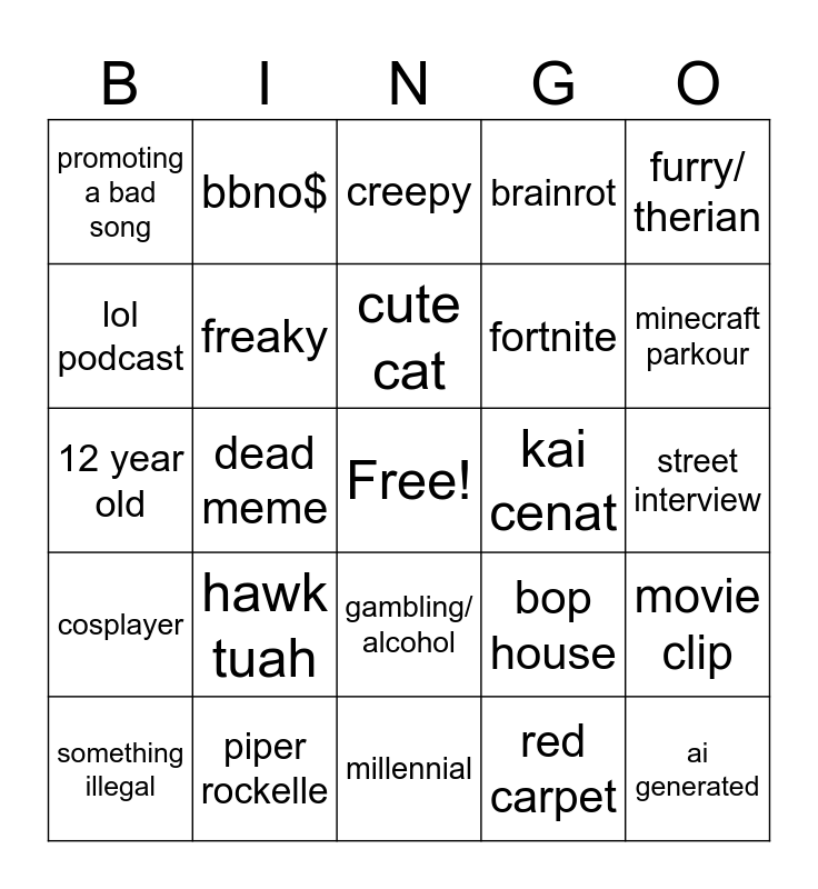 This bingo card has a free space and 24 words: hawk tuah, piper rockelle, cute cat, something illegal, furry/ therian, promoting a bad song, lol podcast, bbno$, kai cenat, gambling/ alcohol, fortnite, 12 year old, bop house, movie clip, freaky, red carpet, street interview, creepy, minecraft parkour, dead meme, ai generated, cosplayer, brainrot and millennial.