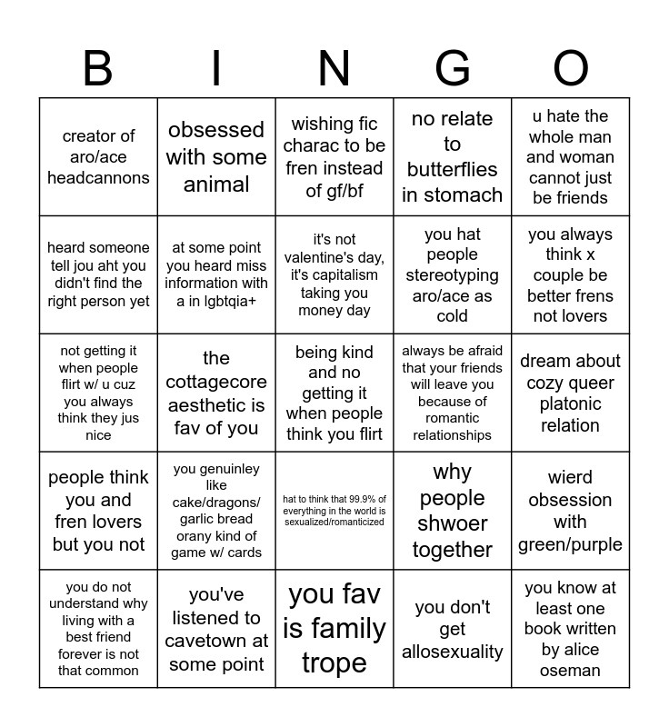 This bingo card has a free space and 24 words: you genuinley like cake/dragons/ garlic bread orany kind of game w/ cards, you've listened to cavetown at some point, it's not valentine's day, it's capitalism taking you money day, you do not understand why living with a best friend forever is not that common, u hate the whole man and woman cannot just be friends, creator of aro/ace headcannons, heard someone tell jou aht you didn't find the right person yet, obsessed with some animal, always be afraid that your friends will leave you because of romantic relationships, hat to think that 99.9% of everything in the world is sexualized/romanticized, you hat people stereotyping aro/ace as cold, not getting it when people flirt w/ u cuz you always think they jus nice, why people shwoer together, wierd obsession with green/purple, at some point you heard miss information with a in lgbtqia+, you don't get allosexuality, dream about cozy queer platonic relation, wishing fic charac to be fren instead of gf/bf, you always think x couple be better frens not lovers, the cottagecore aesthetic is fav of you, you know at least one book written by alice oseman, people think you and fren lovers but you not, no relate to butterflies in stomach and you fav is family trope.