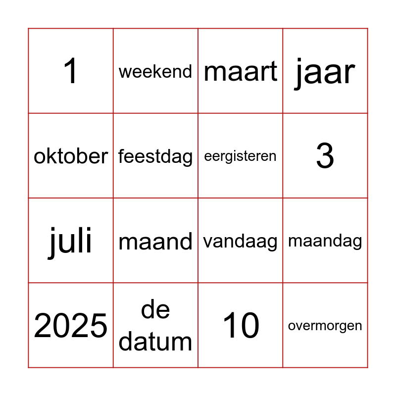 This bingo card has 16 words: de datum, maandag, maart, 1, juli, weekend, vandaag, 10, oktober, feestdag, 2025, jaar, maand, 3, eergisteren and overmorgen.