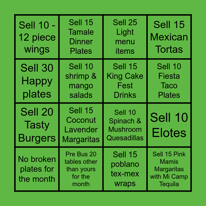 This bingo card has 16 words: No broken plates for the month, Pre Bus 20 tables other than yours for the month, Sell 25 Light menu items, Sell 15 Mexican Tortas, Sell 30 Happy plates, Sell 15 Tamale Dinner Plates, Sell 10 Spinach & Mushroom Quesadillas, Sell 10 Elotes, Sell 10 - 12 piece wings, Sell 10 shrimp & mango salads, Sell 15 poblano tex-mex wraps, Sell 10 Fiesta Taco Plates, Sell 20 Tasty Burgers, Sell 15 Coconut Lavender Margaritas, Sell 15 King Cake Fest Drinks and Sell 15 Pink Mamis Margaritas with Mi Camp Tequila.