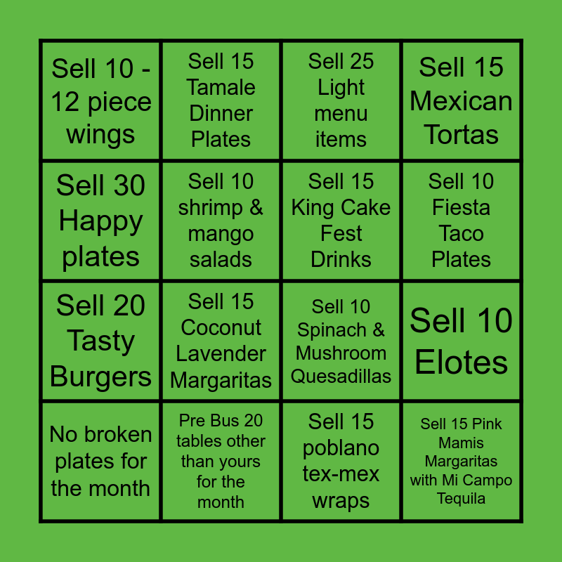 This bingo card has 16 words: No broken plates for the month, Pre Bus 20 tables other than yours for the month, Sell 25 Light menu items, Sell 15 Mexican Tortas, Sell 30 Happy plates, Sell 15 Tamale Dinner Plates, Sell 10 Spinach & Mushroom Quesadillas, Sell 10 Elotes, Sell 10 - 12 piece wings, Sell 10 shrimp & mango salads, Sell 15 poblano tex-mex wraps, Sell 10 Fiesta Taco Plates, Sell 20 Tasty Burgers, Sell 15 Coconut Lavender Margaritas, Sell 15 King Cake Fest Drinks and Sell 15 Pink Mamis Margaritas with Mi Campo Tequila.