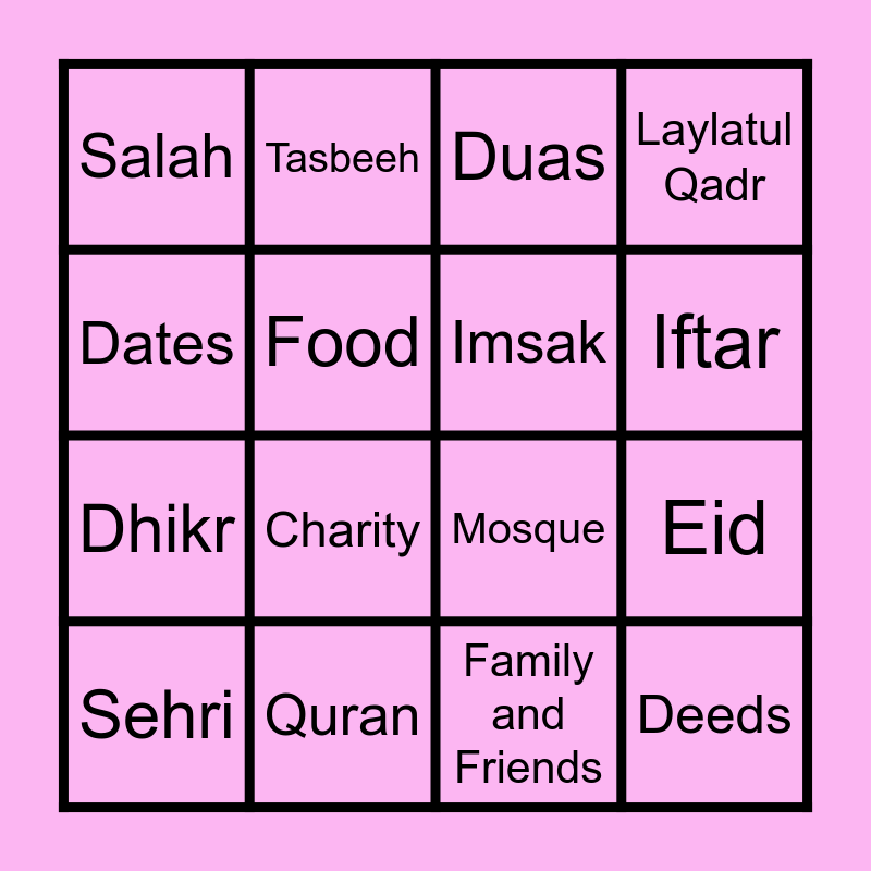 This bingo card has 16 words: Quran, Eid, Duas, Salah, Dhikr, Tasbeeh, Mosque, Family and Friends, Dates, Food, Sehri, Laylatul Qadr, Charity, Iftar, Imsak and Deeds.