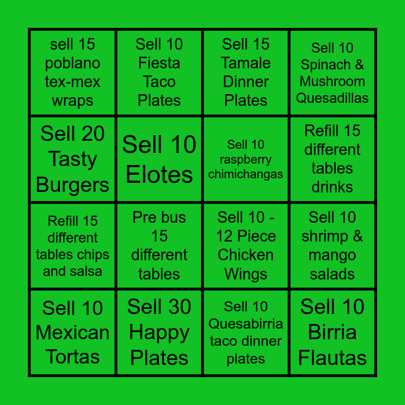 This bingo card has 16 words: Sell 10 Mexican Tortas, Sell 30 Happy Plates, Sell 15 Tamale Dinner Plates, Sell 10 Spinach & Mushroom Quesadillas, Sell 20 Tasty Burgers, Sell 10 Fiesta Taco Plates, Sell 10 - 12 Piece Chicken Wings, Sell 10 shrimp & mango salads, sell 15 poblano tex-mex wraps, Sell 10 Elotes, Sell 10 Quesabirria taco dinner plates, Refill 15 different tables drinks, Refill 15 different tables chips and salsa, Pre bus 15 different tables, Sell 10 raspberry chimichangas and Sell 10 Birria Flautas.