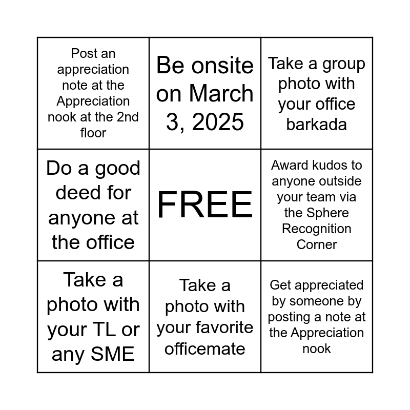 This bingo card has a free space and 8 words: Award kudos to anyone outside your team via the Sphere Recognition Corner, Take a group photo with your office barkada, Be onsite on March 3, 2025, Take a photo with your TL or any SME, Post an appreciation note at the Appreciation nook at the 2nd floor, Get appreciated by someone by posting a note at the Appreciation nook, Do a good deed for anyone at the office and Take a photo with your favorite officemate.