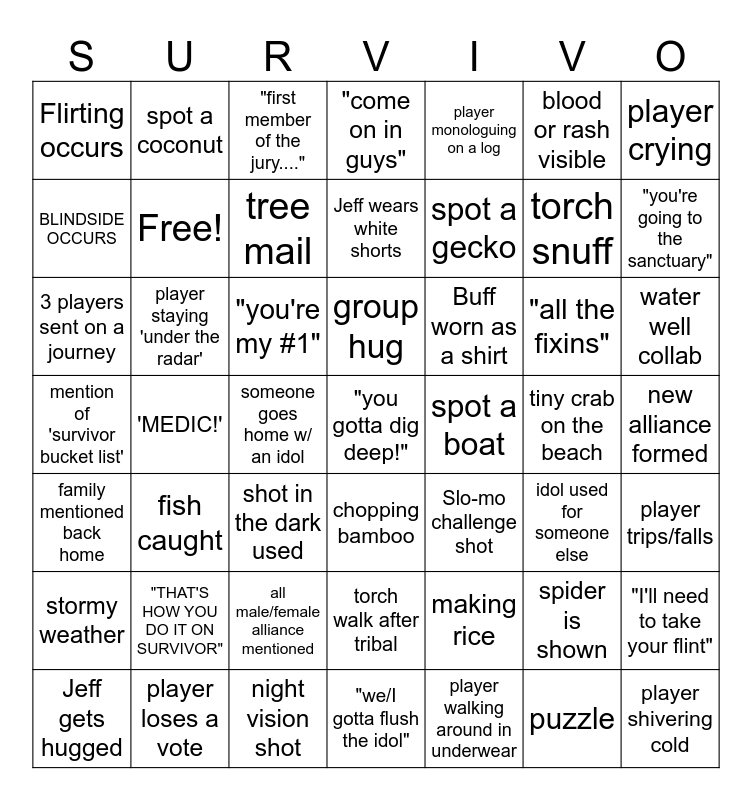 This bingo card has a free space and 48 words: making rice, torch snuff, "we/I gotta flush the idol", 'MEDIC!', "you're my #1", new alliance formed, spot a coconut, player loses a vote, blood or rash visible, chopping bamboo, player crying, "come on in guys", "all the fixins", Buff worn as a shirt, stormy weather, tiny crab on the beach, BLINDSIDE OCCURS, "you're going to the sanctuary", spider is shown, player monologuing on a log, spot a gecko, someone goes home w/ an idol, Flirting occurs, Free!, "I'll need to take your flint", tree mail, water well collab, Jeff gets hugged, group hug, player staying 'under the radar', puzzle, spot a boat, player trips/falls, "THAT'S HOW YOU DO IT ON SURVIVOR", mention of 'survivor bucket list', Slo-mo challenge shot, idol used for someone else, 3 players sent on a journey, shot in the dark used, all male/female alliance mentioned, family mentioned back home, player shivering cold, "first member of the jury....", night vision shot, Jeff wears white shorts, torch walk after tribal, fish caught and player walking around in underwear.