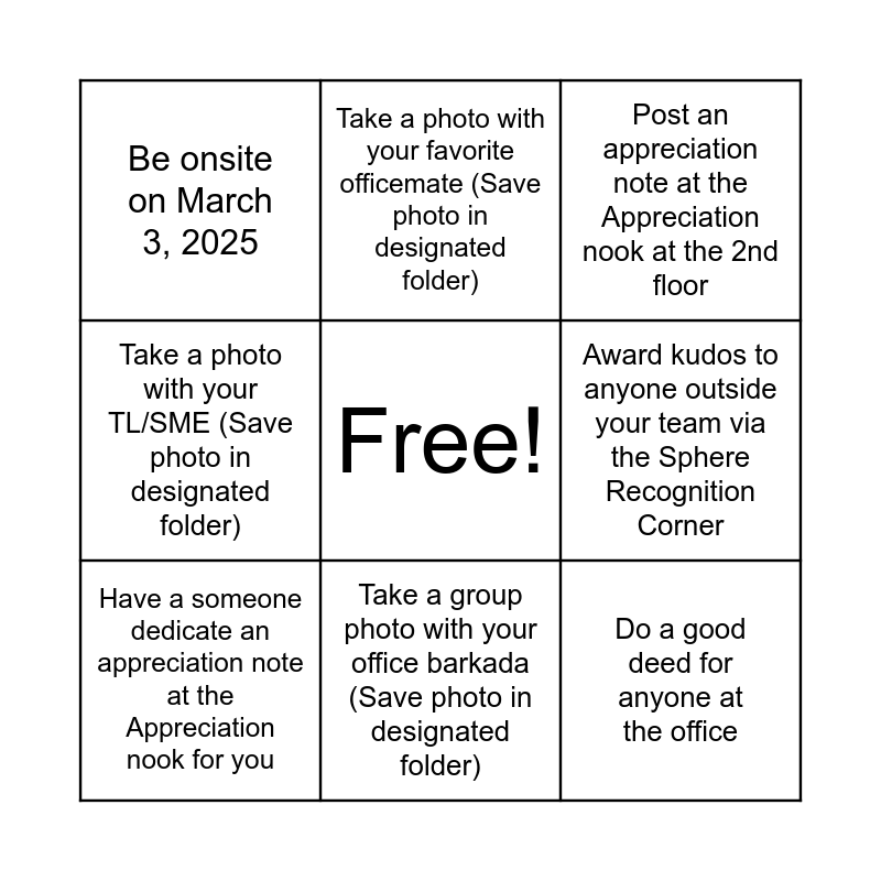 This bingo card has a free space and 8 words: Award kudos to anyone outside your team via the Sphere Recognition Corner, Post an appreciation note at the Appreciation nook at the 2nd floor, Take a photo with your favorite officemate (Save photo in designated folder), Have a someone dedicate an appreciation note at the Appreciation nook for you, Be onsite on March 3, 2025, Do a good deed for anyone at the office, Take a photo with your TL/SME (Save photo in designated folder) and Take a group photo with your office barkada (Save photo in designated folder).