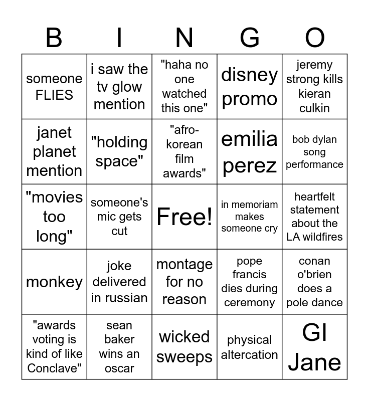This bingo card has a free space and 24 words: joke delivered in russian, sean baker wins an oscar, "afro-korean film awards", "awards voting is kind of like Conclave", jeremy strong kills kieran culkin, someone FLIES, janet planet mention, i saw the tv glow mention, in memoriam makes someone cry, montage for no reason, emilia perez, "movies too long", pope francis dies during ceremony, conan o'brien does a pole dance, "holding space", physical altercation, heartfelt statement about the LA wildfires, "haha no one watched this one", bob dylan song performance, someone's mic gets cut, GI Jane, monkey, disney promo and wicked sweeps.