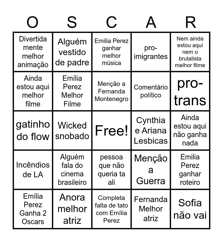 This bingo card has a free space and 24 words: Emília Perez Ganha 2 Oscars, Alguém fala do cinema brasileiro, Menção a Fernanda Montenegro, Fernanda Melhor atriz, Nem ainda estou aqui nem o brutalista melhor filme, Divertida mente melhor animação, Alguém vestido de padre, Emilia Perez ganhar melhor música, Cynthia e Ariana Lesbicas, Ainda estou aqui não ganha nada, gatinho do flow, Emília Perez Melhor Filme, Menção a Guerra, Emilia Perez ganhar roteiro, Ainda estou aqui melhor filme, Anora melhor atriz, Completa falta de tato com Emília Perez, pro-imigrantes, pro-trans, Incêndios de LA, Wicked snobado, pessoa que não queria ta ali, Comentário político and Sofia não vai.