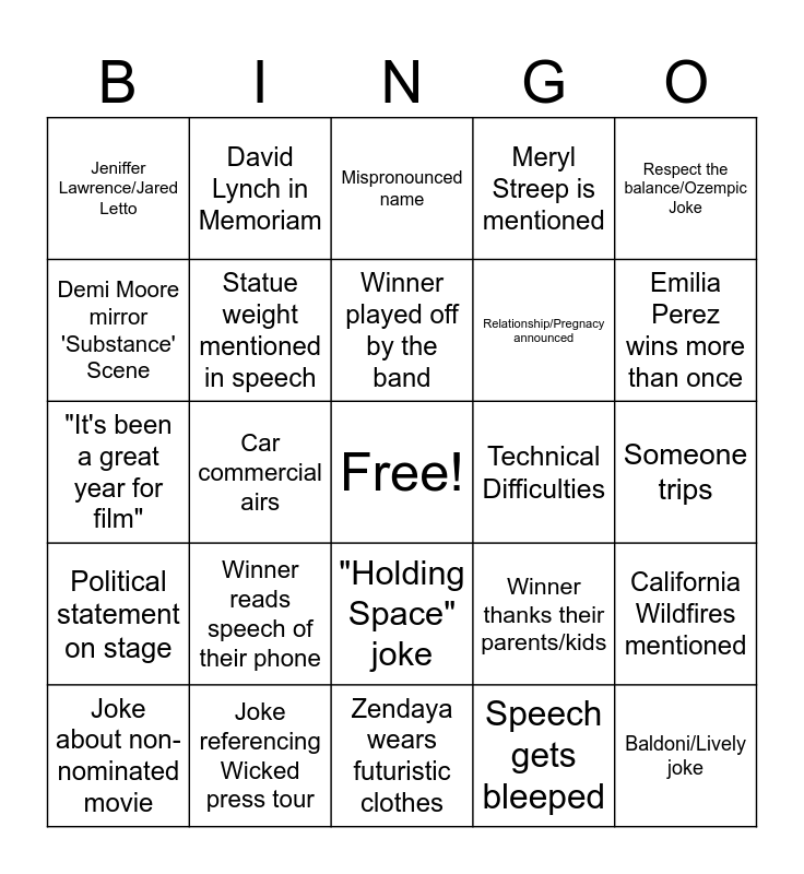 This bingo card has a free space and 24 words: Winner reads speech of their phone, Joke referencing Wicked press tour, Winner played off by the band, Joke about non-nominated movie, Respect the balance/Ozempic Joke, Jeniffer Lawrence/Jared Letto, Demi Moore mirror 'Substance' Scene, David Lynch in Memoriam, Technical Difficulties, "Holding Space" joke, Relationship/Pregnacy announced, "It's been a great year for film", Winner thanks their parents/kids, California Wildfires mentioned, Statue weight mentioned in speech, Speech gets bleeped, Someone trips, Mispronounced name, Emilia Perez wins more than once, Car commercial airs, Baldoni/Lively joke, Political statement on stage, Meryl Streep is mentioned and Zendaya wears futuristic clothes.