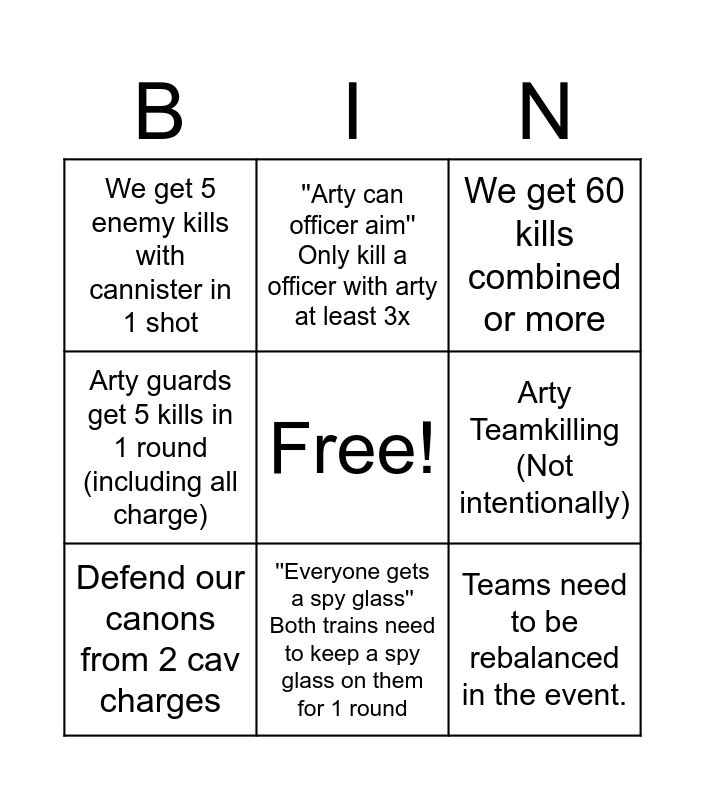 This bingo card has a free space and 8 words: Arty Teamkilling (Not intentionally), We get 60 kills combined or more, ''Arty can officer aim'' Only kill a officer with arty at least 3x, Defend our canons from 2 cav charges, We get 5 enemy kills with cannister in 1 shot, Teams need to be rebalanced in the event., Arty guards get 5 kills in 1 round (including all charge) and ''Everyone gets a spy glass'' Both trains need to keep a spy glass on them for 1 round.