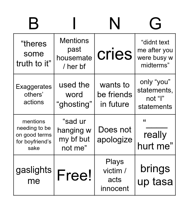 This bingo card has 16 words: Free!, “____ really hurt me”, cries, “theres some truth to it”, mentions needing to be on good terms for boyfriend’s sake, Mentions past housemate / her bf, Does not apologize, Plays victim / acts innocent, Exaggerates others’ actions, used the word “ghosting”, gaslights me, “didnt text me after you were busy w midterms”, “sad ur hanging w my bf but not me”, only “you” statements, not “I” statements, wants to be friends in future and brings up tasa.