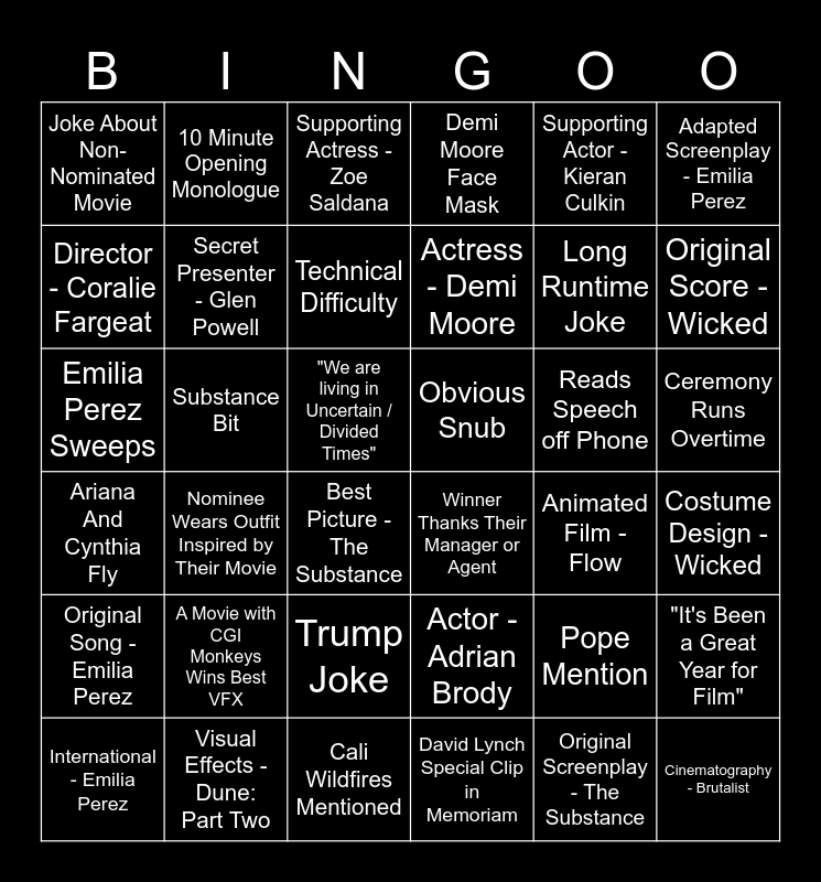 This bingo card has 36 words: Actor - Adrian Brody, Trump Joke, David Lynch Special Clip in Memoriam, Director - Coralie Fargeat, Ariana And Cynthia Fly, Obvious Snub, Secret Presenter - Glen Powell, Cali Wildfires Mentioned, Supporting Actor - Kieran Culkin, Pope Mention, Original Score - Wicked, Demi Moore Face Mask, "It's Been a Great Year for Film", Substance Bit, Actress - Demi Moore, Joke About Non-Nominated Movie, Original Song - Emilia Perez, Reads Speech off Phone, Emilia Perez Sweeps, Supporting Actress - Zoe Saldana, "We are living in Uncertain / Divided Times", Nominee Wears Outfit Inspired by Their Movie, Winner Thanks Their Manager or Agent, Best Picture - The Substance, Animated Film - Flow, 10 Minute Opening Monologue, Long Runtime Joke, Visual Effects - Dune: Part Two, Technical Difficulty, Adapted Screenplay - Emilia Perez, Cinematography - Brutalist, International - Emilia Perez, Costume Design - Wicked, Ceremony Runs Overtime, A Movie with CGI Monkeys Wins Best VFX and Original Screenplay - The Substance.