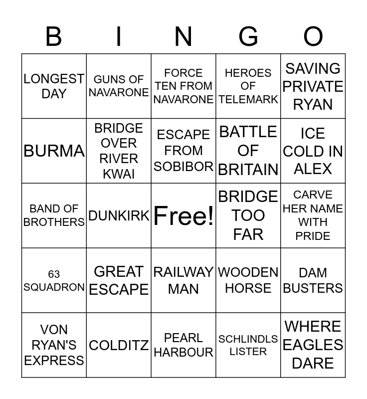 This bingo card has a free space and 24 words: GREAT ESCAPE, COLDITZ, ESCAPE FROM SOBIBOR, VON RYAN'S EXPRESS, SAVING PRIVATE RYAN, LONGEST DAY, BURMA, GUNS OF NAVARONE, BRIDGE TOO FAR, RAILWAY MAN, BATTLE OF BRITAIN, BAND OF BROTHERS, WOODEN HORSE, DAM BUSTERS, BRIDGE OVER RIVER KWAI, SCHLINDLS LISTER, CARVE HER NAME WITH PRIDE, FORCE TEN FROM NAVARONE, ICE COLD IN ALEX, DUNKIRK, WHERE EAGLES DARE, 63 SQUADRON, HEROES OF TELEMARK and PEARL HARBOUR.