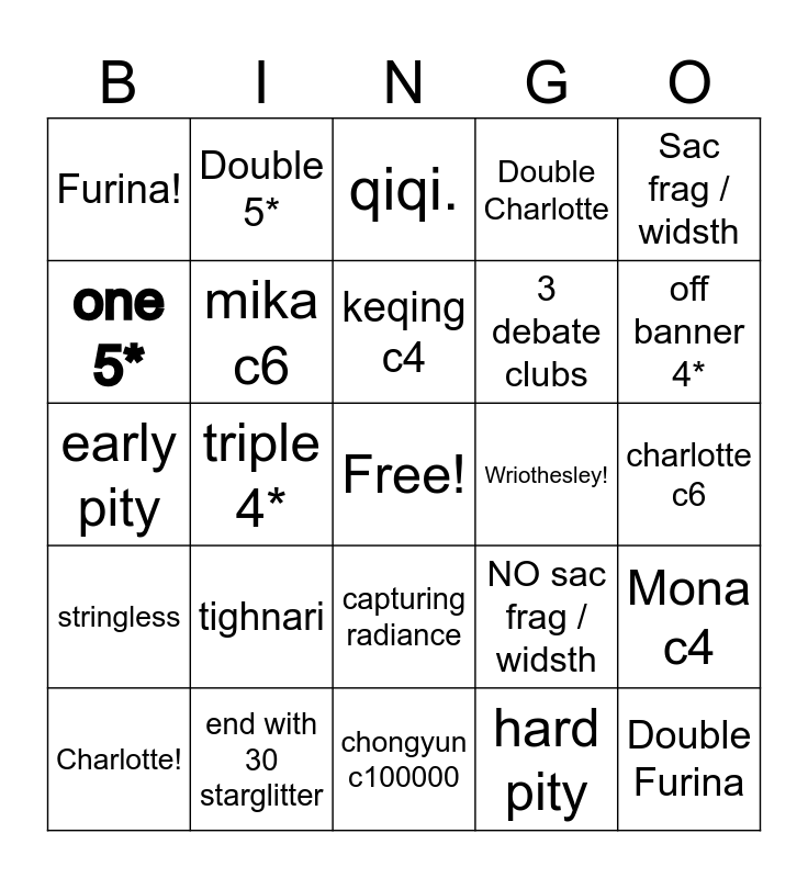 This bingo card has a free space and 24 words: Charlotte!, tighnari, keqing c4, hard pity, Sac frag / widsth, Furina!, Double 5*, qiqi., Wriothesley!, charlotte c6, early pity, mika c6, NO sac frag / widsth, Mona c4, one 5*, end with 30 starglitter, chongyun c100000, Double Charlotte, off banner 4*, stringless, triple 4*, capturing radiance, 3 debate clubs and Double Furina.