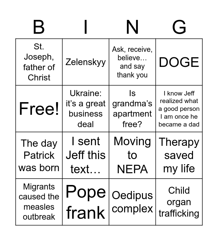 This bingo card has 16 words: Pope frank, Therapy saved my life, Ask, receive, believe… and say thank you, St. Joseph, father of Christ, The day Patrick was born, Zelenskyy, Moving to NEPA, Oedipus complex, Free!, Ukraine: it’s a great business deal, Migrants caused the measles outbreak, DOGE, I sent Jeff this text…, I know Jeff realized what a good person I am once he became a dad, Is grandma’s apartment free? and Child organ trafficking.